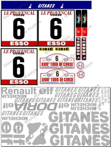 Liste des éléments de la déco : elf, gitanes, renault, doria, thomson, cibié, ferodo, michelin, plaques du rallye, N° de portières,noms pilote/copilote, pare soleil.