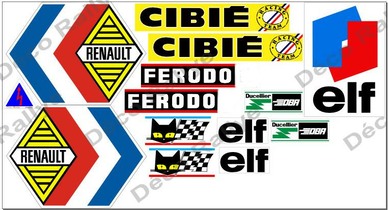 Liste des éléments de la déco : elf , cibié, michelin, ducellier, losange renault, sev marchal, ferodo, coupe circuit. Possibilité d’ajouter les plaques du rallye, les N° de portières et les transferts Alpine Renault des ailes arrières.