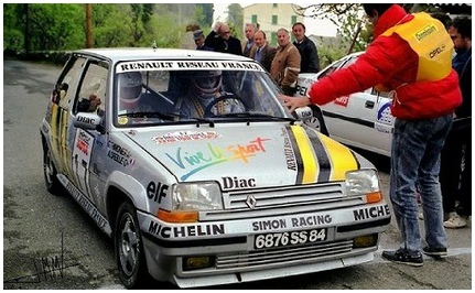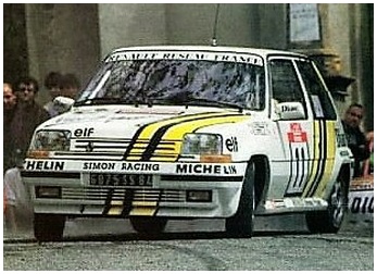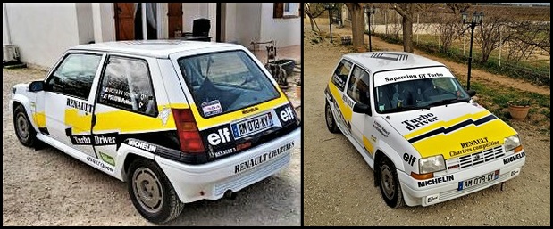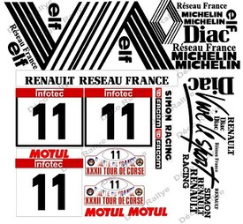 Liste des éléments de la déco : diac, elf, renault, losange renault, michelin, bandes noires, bibendum, vive le sport, simon racing. Possibilité d’ajouter les plaques du rallye, les N° de portières et les noms pilote/copilote.