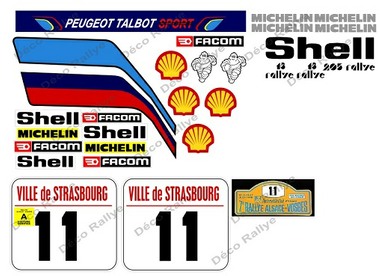 Liste des éléments de la déco : bandes capot, shell, coquille shell, bibendum michelin, michelin, pare soleil peugeot talbot sport, logos 205 rallye 1.3, facom, plaque du rallye, N° de portières.
