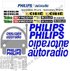 Liste des éléments de la déco : elf, valéo, michelin, losange renault, philips autoradio, bilstein, facom, cibié, bozian, renault sport, galtier grenoble. Possibilité d’ajouter les plaques du rallye et les N° de portières.