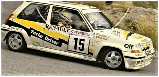 Liste des éléments de la déco : diac, elf, renault, losange renault, michelin, bandes noires, bibendum, vive le sport, simon racing. Possibilité d’ajouter les plaques du rallye, les N° de portières et les noms pilote/copilote.